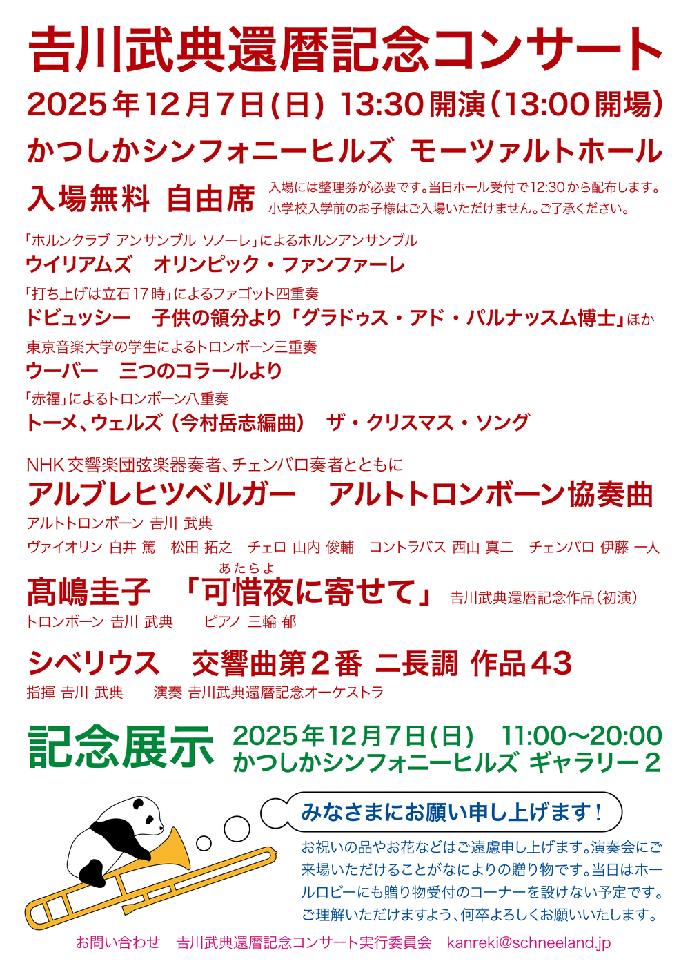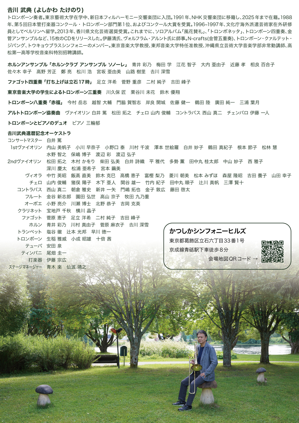NHK交響楽団トロンボーン奏者として33年活動し、現在は東京音楽大学で教授として後進の指導に当たる吉川武典の還暦を記念し、コンサートを開催します。