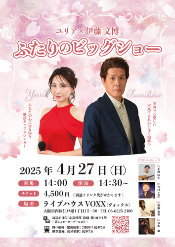 美声で優しいシンガーソングライターの伊藤文博と、あなたの心に寄り添う歌謡ポップスシンガーユリアのツーマンライブです!